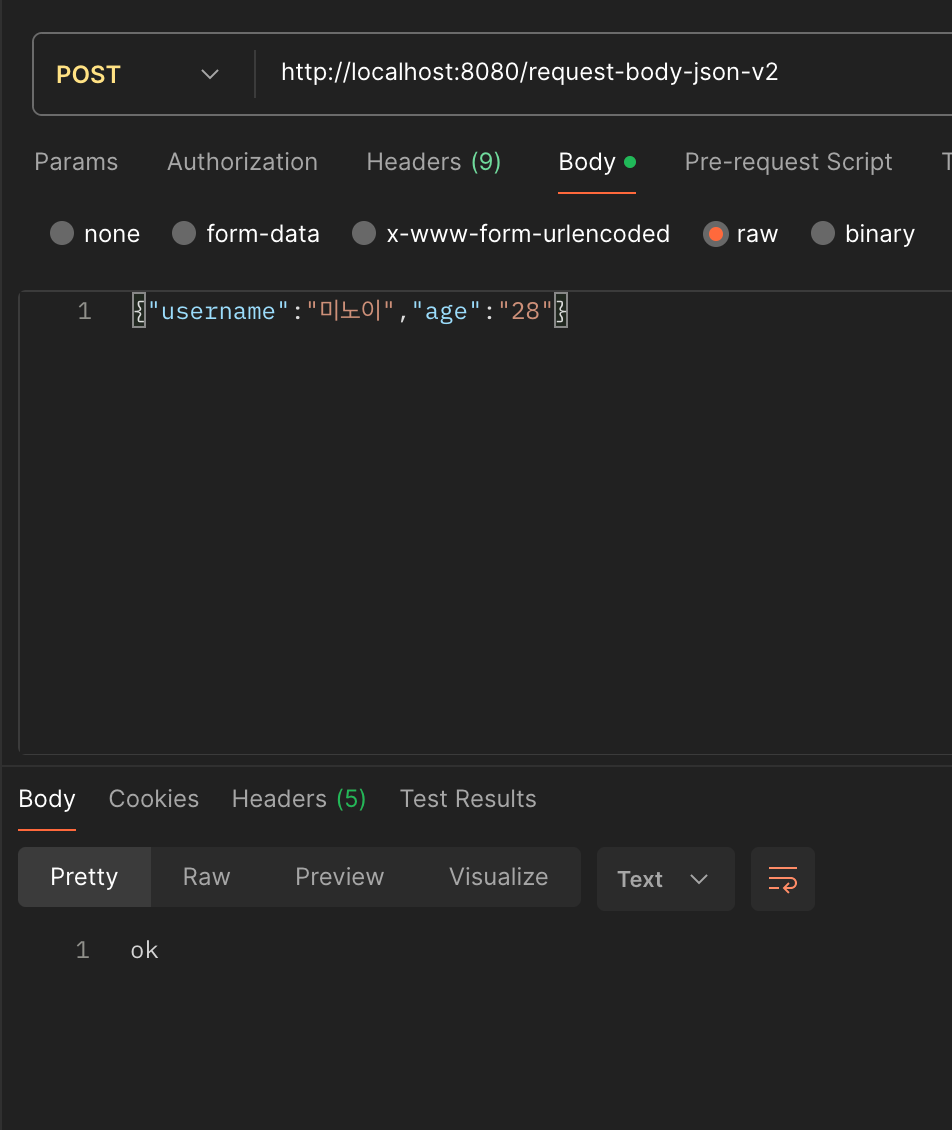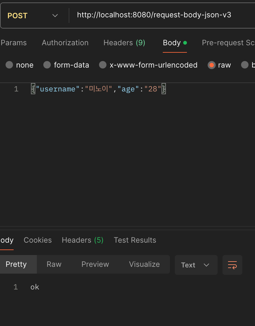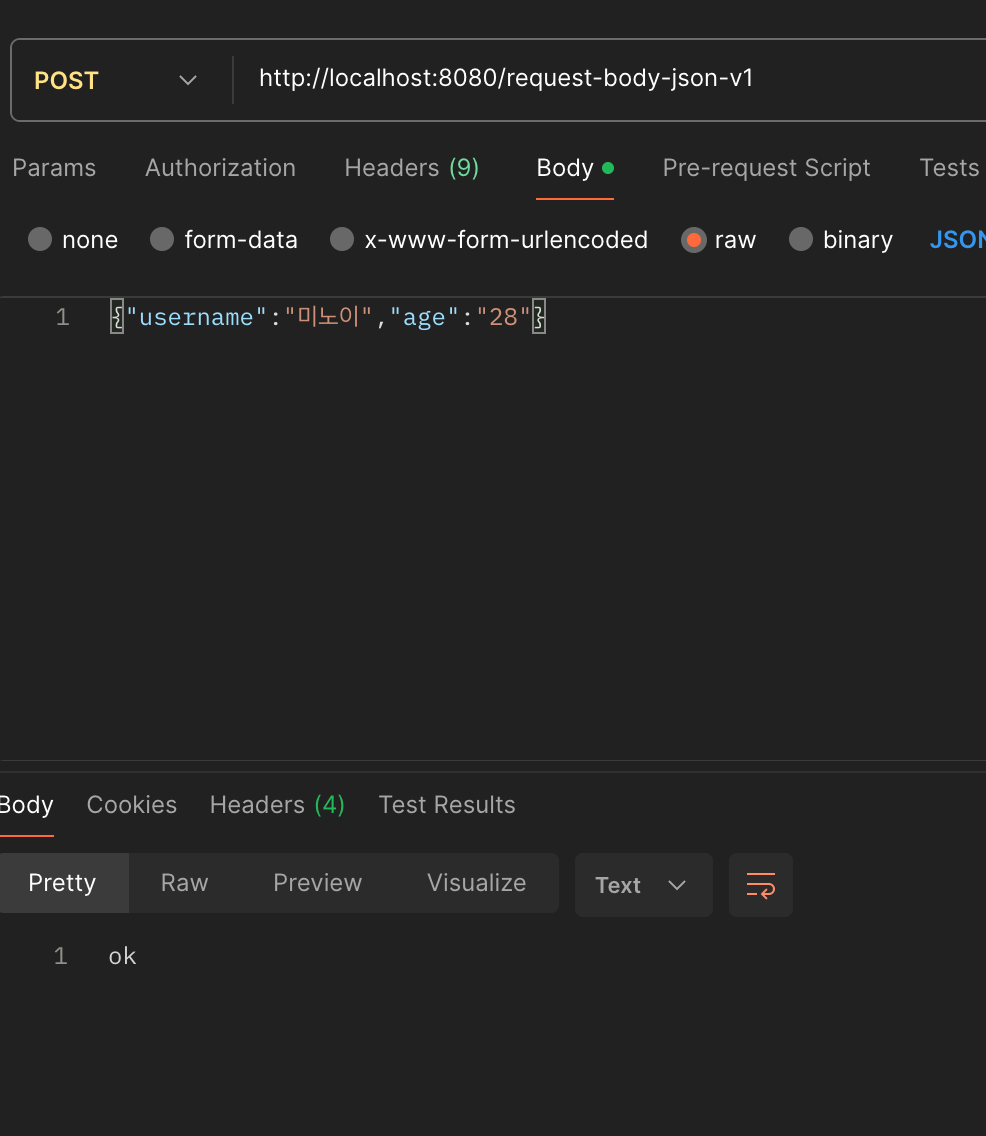 4)HttpEntity를 사용하여 JSON 요청 본문을 HelloData 객체로 직접 받아 처리하는 방법@ResponseBody @PostMapping("/request-body-json-v4") public String requestBodyJsonV4(HttpEntity<HelloData> httpEntity) { // HttpEntity에서 본문을 추출하여 HelloData 객체로 변환 HelloData data = httpEntity.getBody(); // HelloData 객체의 필드를 로그에 출력 log.info("username = {} , age = {}", data.getUsername(), data.getAge()); // 응답 본문에 "ok" 반환 return "ok"; }Postman