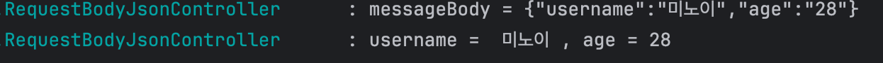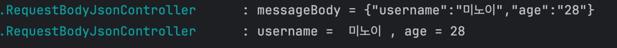 2) @RequestBody를 사용하여 JSON 요청 본문을 String으로 직접 받아 처리하는 방법@ResponseBody @PostMapping("/request-body-json-v2") public String requestBodyJsonV2(@RequestBody String messageBody) throws IOException { // 요청 본문을 로그에 출력 log.info("messageBody = {}", messageBody); // JSON 문자열을 HelloData 객체로 변환 HelloData helloData = objectMapper.readValue(messageBody, HelloData.class); // HelloData 객체의 필드를 로그에 출력 log.info("username = {} , age = {}", helloData.getUsername(), helloData.getAge()); // 응답 본문에 "ok" 반환 return "ok"; }