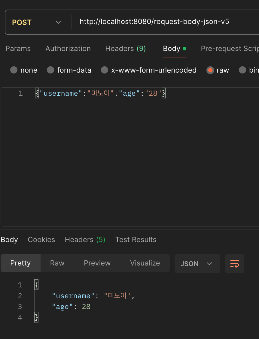 5) @RequestBody를 사용하여 JSON 요청 본문을 HelloData 객체로 직접 받아 처리하고, 이를 그대로 응답 본문으로 반환하는 방법@ResponseBody @PostMapping("/request-body-json-v5") public HelloData requestBodyJsonV5(@RequestBody HelloData data) { // HelloData 객체의 필드를 로그에 출력 log.info("username = {} , age = {}", data.getUsername(), data.getAge()); // HelloData 객체를 응답 본문으로 반환 return data; }