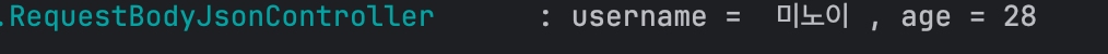 - @RequestBody에 직접 만든 객체를 지정할 수 있다.@ResponseBody @PostMapping("/request-body-json-v3") public String requestBodyJsonV3(@RequestBody HelloData helloData) { // HelloData 객체의 필드를 로그에 출력 log.info("username = {} , age = {}", helloData.getUsername(), helloData.getAge()); // 응답 본문에 "ok" 반환 return "ok"; }