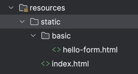 정적 리소스 경로 : src/main/resources/static 다음 경로에 파일이 들어있으면 `src/main/resources/static/basic/hello-form.html` 웹 브라우저에서 다음과 같이 실행하면 된다. `http://localhost:8080/basic/hello-form.html`