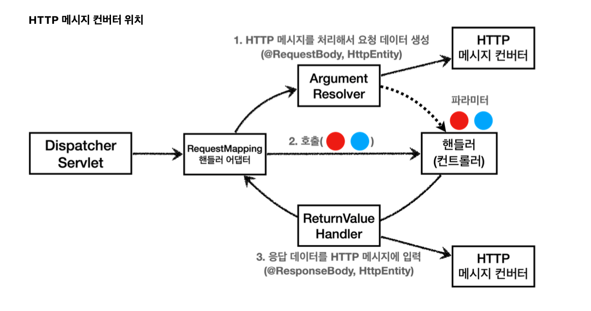 HTTP 메시지 컨버터란?: 웹 애플리케이션에서 HTTP 요청과 응답의 본문을 객체로 변환하거나, 객체를 HTTP 메시지로 변환하는 역할을 하는 컴포넌트HTTP 메시지 컨버터를 사용하는 `@RequestBody` 도 컨트롤러가 필요로 하는 파라미터의 값에 사용된다.`@ResponseBody` 의 경우도 컨트롤러의 반환 값을 이용한다.