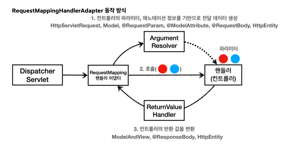 애노테이션 기반 컨트롤러는 `HttpServletRequest`, `Model`뿐만 아니라 `@RequestParam`, `@ModelAttribute` 같은 애노테이션, 그리고 `@RequestBody`, `HttpEntity`와 같은 HTTP 메시지 처리 방식 등 매우 다양한 파라미터를 활용할 수 있다. 이러한 유연한 파라미터 처리가 가능한 이유는 바로 `ArgumentResolver` 덕분이다. 애노테이션 기반 컨트롤러를 처리하는 `RequestMappingHandlerAdapter` 는 바로 이 `ArgumentResolver` 를 호출해서 컨트롤러(핸들러)가 필요로 하는 다양한 파라미터의 값(객체)을 생성한다. 그리고 이렇게 파리미터의 값이 모두 준비되면 컨트롤러를 호출하면서 값을 넘겨준다. 스프링은 30개가 넘는 ArgumentResolver를 기본으로 제공한다.