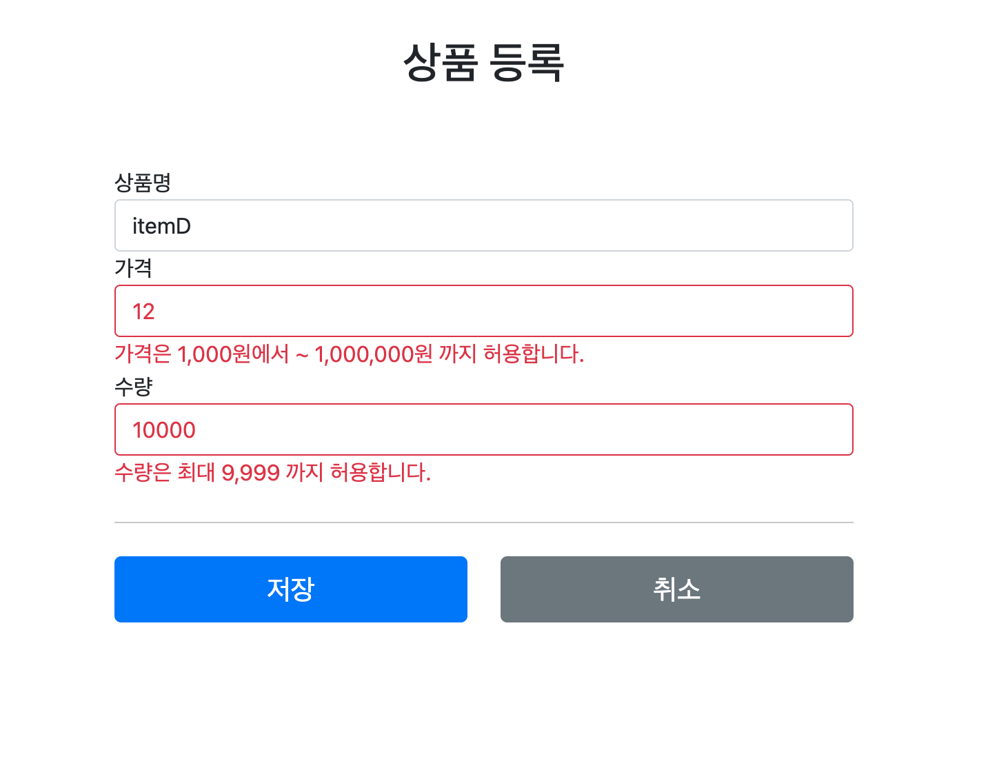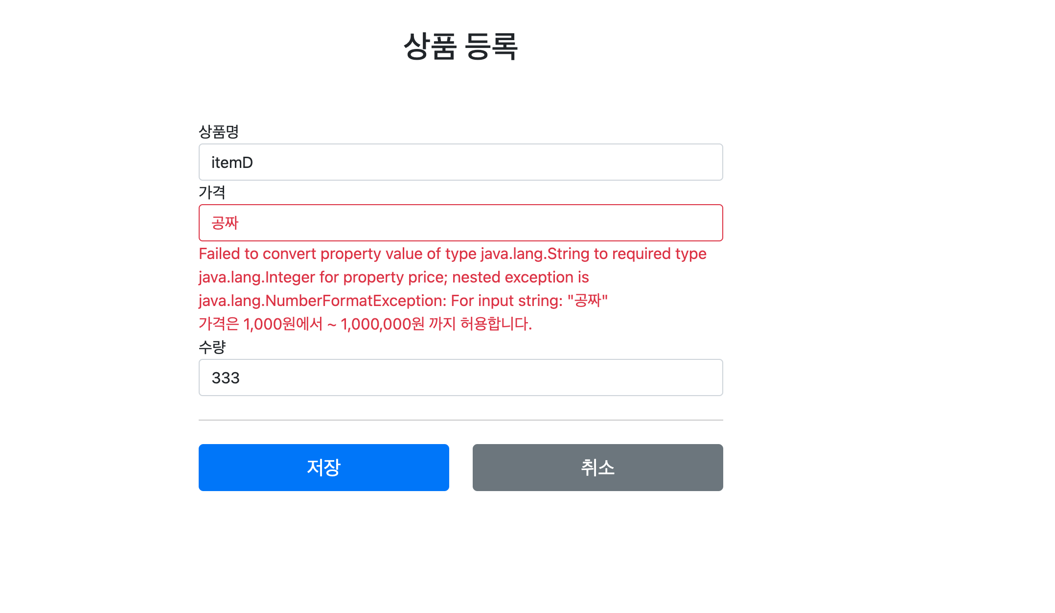 사용자의 입력 데이터가 컨트롤러의 `@ModelAttribute` 에 바인딩되는 시점에 오류가 발생하면 모델 객체에 사용자 입력 값을 유지하기 어렵다. 예를 들어서 가격에 숫자가 아닌 문자가 입력된다면 가격은 `Integer` 타입이므로 문자를 보관할 수 있는 방법이 없다. 그래서 오류가 발생한 경우 사용자 입력 값을 보관하는 별도의 방법이 필요하다. 그리고 이 렇게 보관한 사용자 입력 값을 검증 오류 발생시 화면에 다시 출력하면 된다.