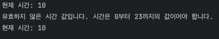 System.out.println("유효하지 않은 시간 값입니다. 시간은 0부터 23까지의 값이어야 합니다.");