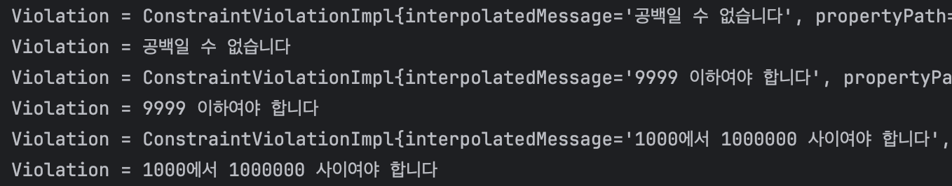 `ConstraintViolation` 출력 결과를 보면, 검증 오류가 발생한 객체, 필드, 메시지 정보등 다양한 정보를 확인할 수 있다.