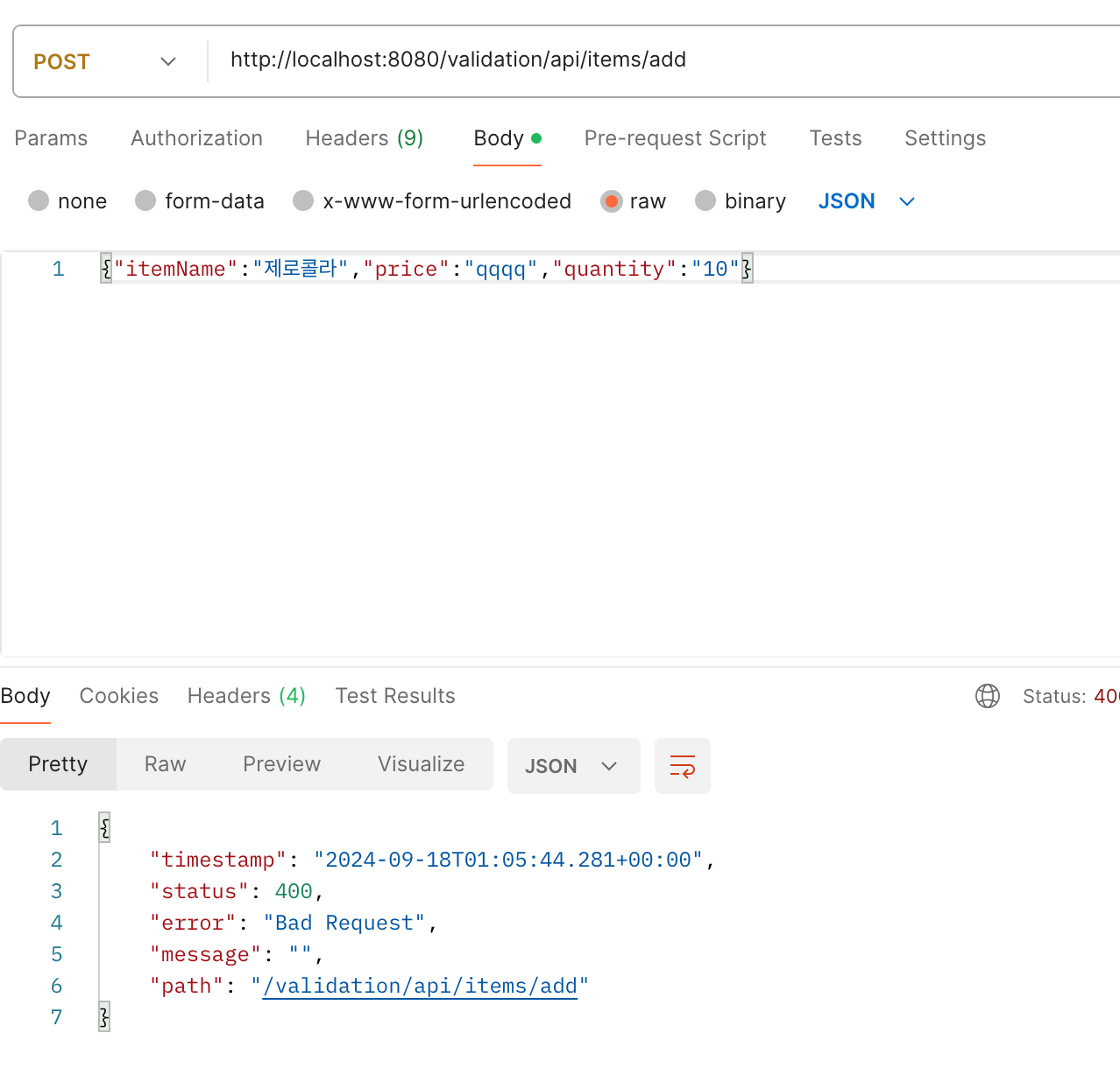 `HttpMessageConverter` 에서 요청 JSON을 `ItemSaveForm` 객체로 생성하는데 실패한다. 이 경우는 `ItemSaveForm` 객체를 만들지 못하기 때문에 컨트롤러 자체가 호출되지 않고 그 전에 예외가 발생한다. 물론 Validator도 실행되지 않는다.