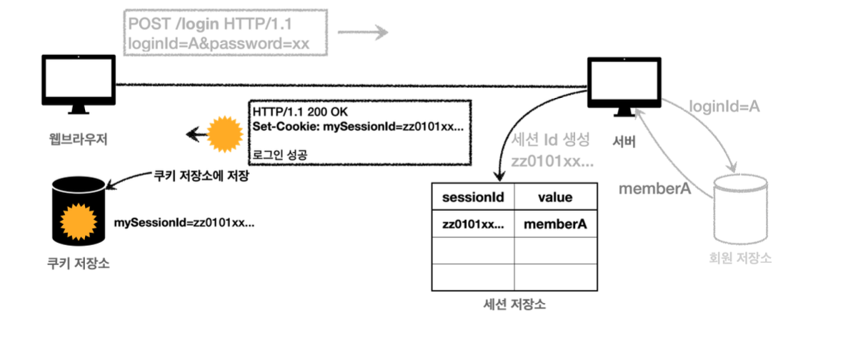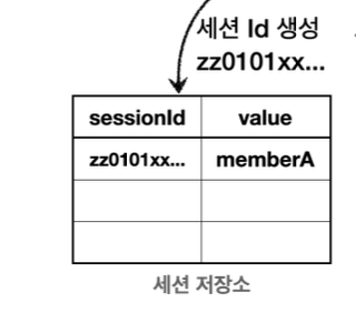 - sessionId 생성 (임의의 추정 불가능한 랜덤 값) - 세션 저장소에 sessionId와 보관할 값 저장 - sessionId로 응답 쿠키를 생성해서 클라이언트에 전달