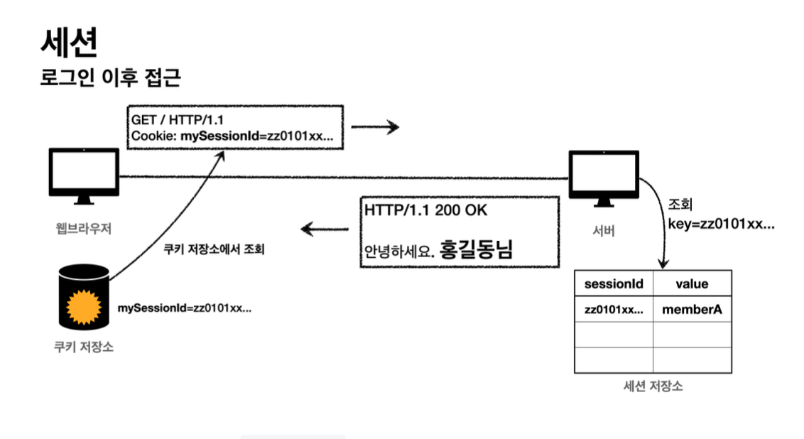 - 클라이언트는 요청시 항상 `mySessionId` 쿠키를 전달한다. - 서버에서는 클라이언트가 전달한 `mySessionId` 쿠키 정보로 세션 저장소를 조회해서 로그인시 보관한 세션 정보를 사용한다.
