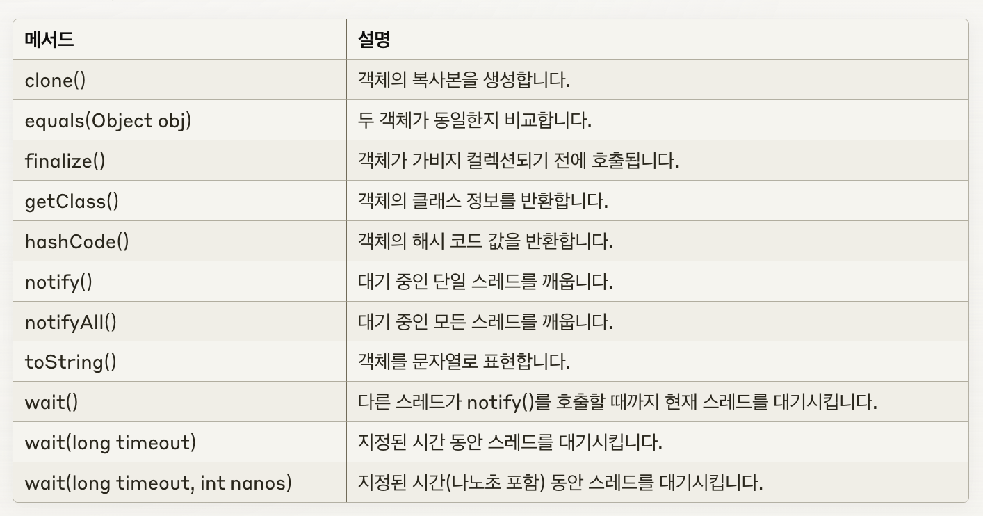 - 모든 클래스의 최고 조상 , 11개의 메서드만을 가지고 있다. - notify(),wait() 등은 쓰레드와 관련된 메서드이다. - 이 클래스는 java.lang 패키지에 속해 있으며, 모든 객체가 공통으로 가져야 할 기본적인 메서드들을 제공합니다.