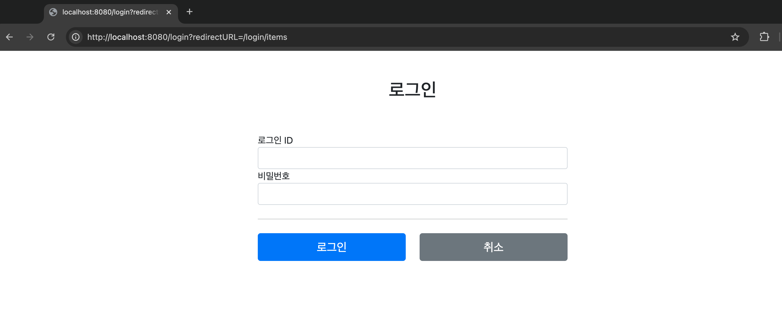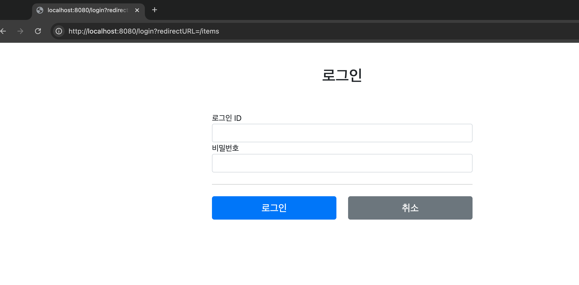 http://localhost:8080/items 로 접근하면 로그인 페이지로 리다이렉트 된다.