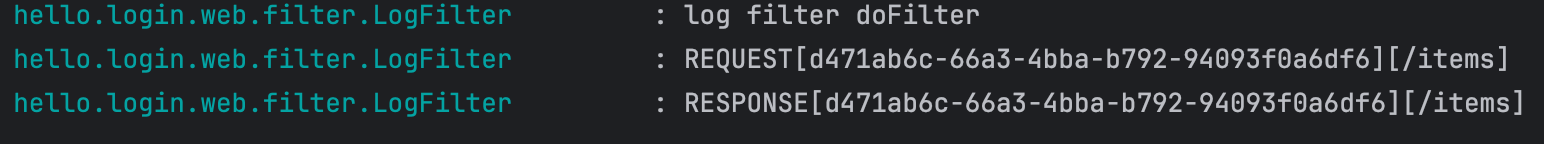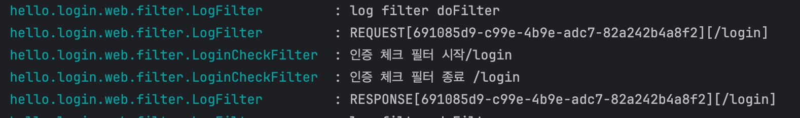 로그 출력 - `setFilter(new LoginCheckFilter())` : 로그인 필터를 등록한다. - `setOrder(2)` : 순서를 2번으로 잡았다. 로그 필터 다음에 로그인 필터가 적용된다. - `addUrlPatterns("/*")` : 모든 요청에 로그인 필터를 적용한다.