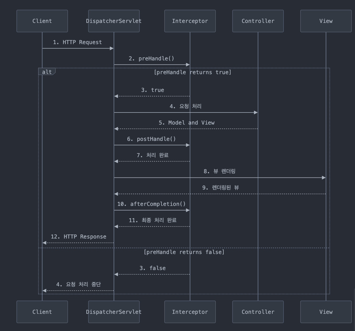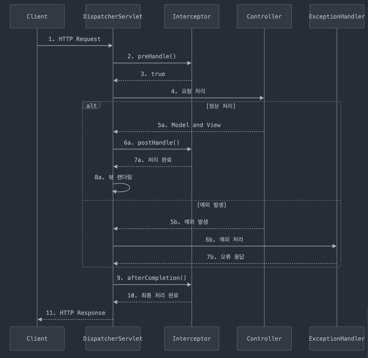 - afterCompletion(): 뷰 렌더링을 포함한 모든 처리가 완료된 후 호출된다. 예외 발생 여부와 관계없이 항상 호출된다. 리소스 해제, 로깅 완료 등의 작업에 유용하다. 발생한 예외에 대한 정보를 파라미터로 받을 수 있어, 예외 처리 후 추가 작업이 가능하다.