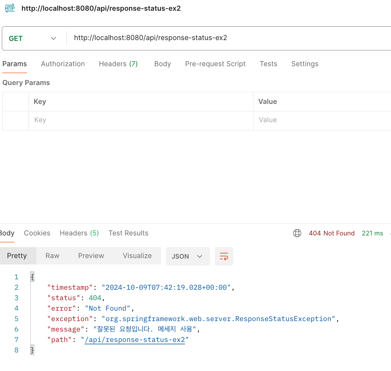 @GetMapping("/api/response-status-ex2") public String responseStatusEx2(){ throw new ResponseStatusException(HttpStatus.NOT_FOUND,"error.bad", new IllegalArgumentException()); }