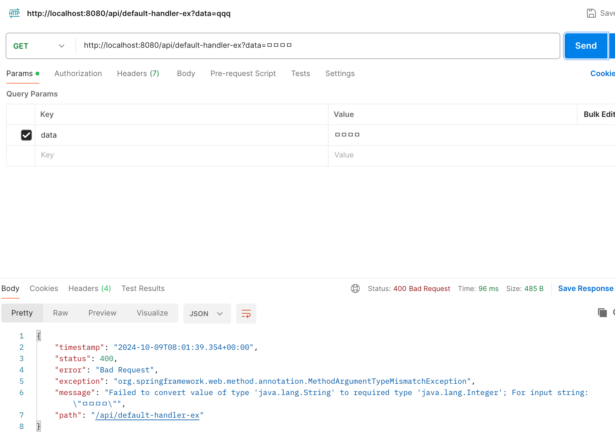DefaultHandlerExceptionResolver.handleTypeMismatch` 를 보면 다음과 같은 코드를 확인할 수 있다.response.sendError(HttpServletResponse.SC_BAD_REQUEST)` (400)결국 `response.sendError()` 를 통해서 문제를 해결한다. sendError(400) 를 호출했기 때문에 WAS에서 다시 오류 페이지(`/error` )를 내부 요청한다.