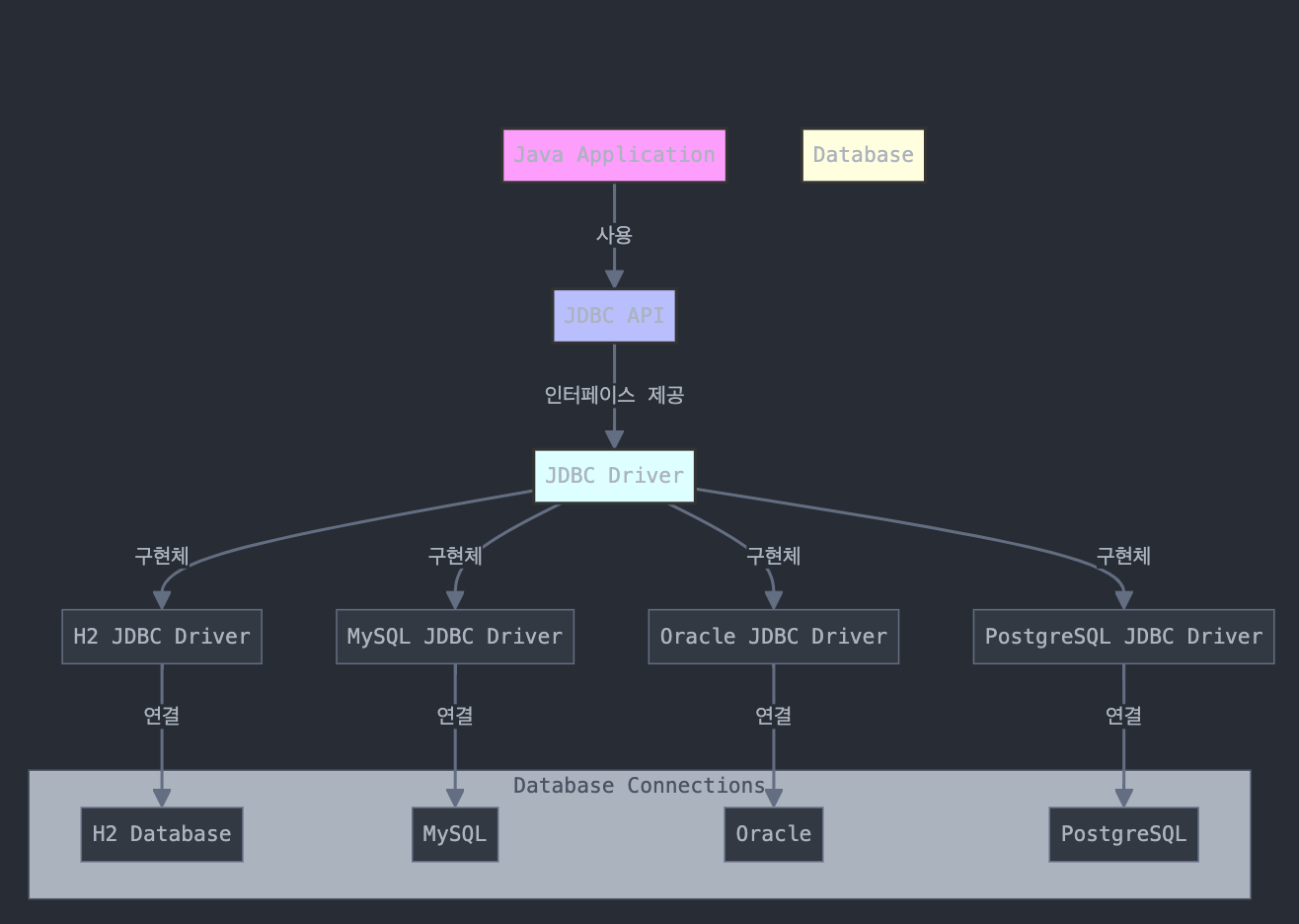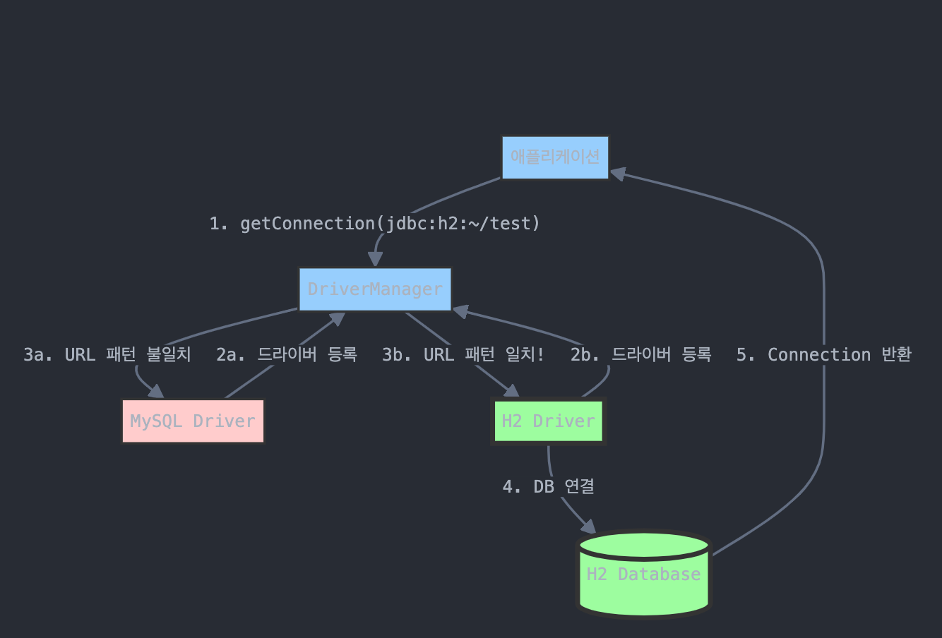 Connection connection = DriverManager.getConnection(URL, USERNAME, PASSWORD); // JDBC에서 제공된 메서드, URL과 자격 증명을 기반으로 적절한 DB 드라이버의 구현체를 찾아 연결 생성