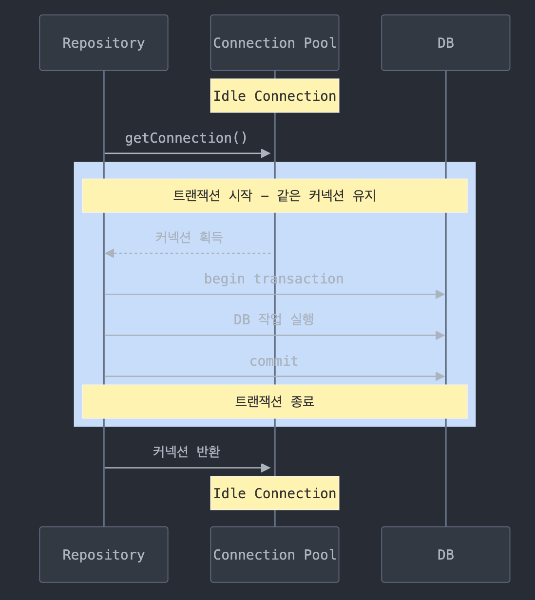 애플리케이션에서 DB 트랜잭션을 사용하려면 트랜잭션을 사용하는 동안 같은 커넥션을 유지해야한다. 그래야 같은 세션을 사용할 수 있다.