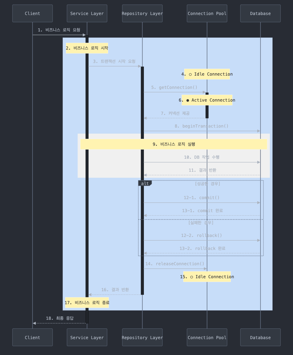 - `con.commit(); //성공시 커밋` : 비즈니스 로직이 정상 수행되면 트랜잭션을 커밋한다. - `con.rollback(); //실패시 롤백 : catch(Ex){..}` 를 사용해서 비즈니스 로직 수행 도중에 예외가 발생하면 트랜잭션을 롤백한 다. - `release(con);` : `finally {..}` 를 사용해서 커넥션을 모두 사용하고 나면 안전하게 종료한다. 그런데 커넥션 풀을 사용하면 `con.close()` 를 호출 했을 때 커넥션이 종료되는 것이 아니라 풀에 반납된다. 현재 수동 커밋 모드로 동작하기 때문에 풀에 돌려주기 전에 기본 값인 자동 커밋 모드로 변경하는 것이 안전하다.