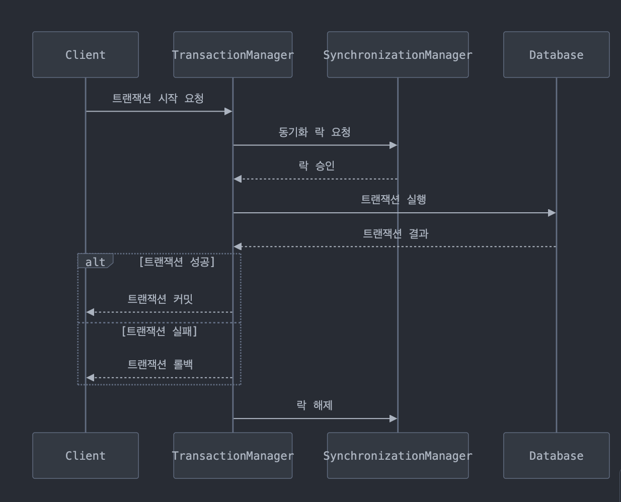 4. 트랜잭션이 종료되면 트랜잭션 매니저는 트랜잭션 동기화 매니저에 보관된 커넥션을 통해 트랜잭션을 종료하고, 커넥션도 닫는다.