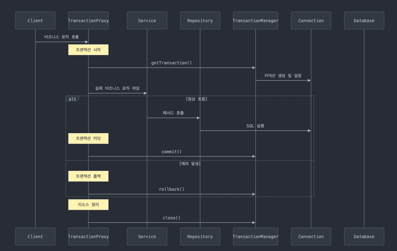 프록시를 사용하면 트랜잭션을 처리하는 객체와 비즈니스 로직을 처리하는 서비스 객체를 명확하게 분리할 수 있다. 트랜잭션 프록시 코드 예시