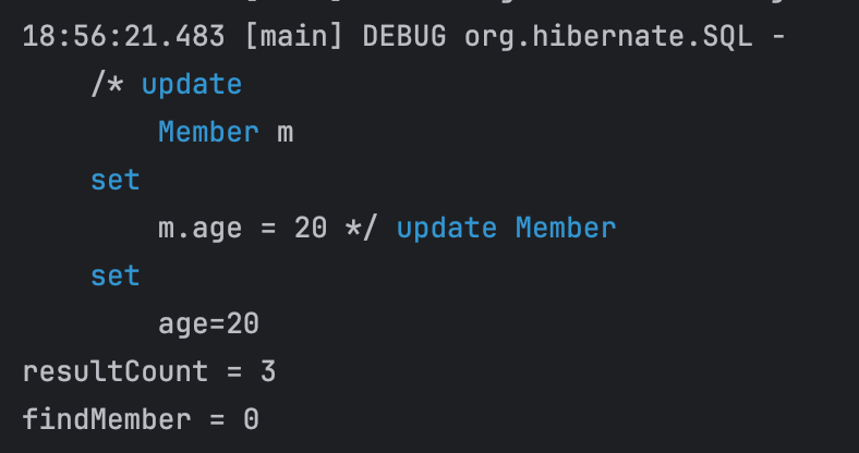 int resultCount = em.createQuery("update Member m set m.age = 20")