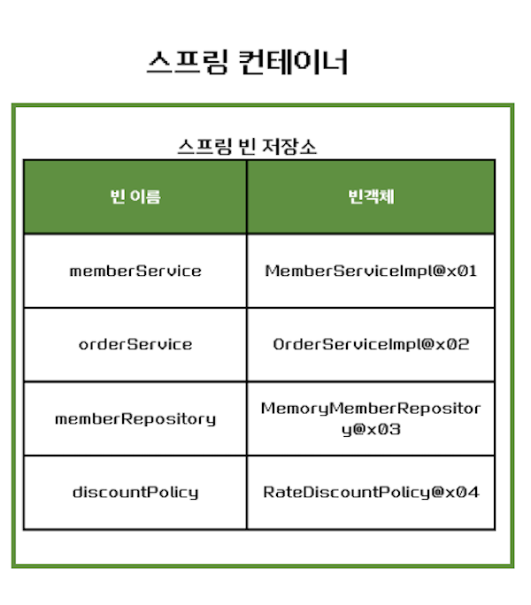 1) 스프링 컨테이너는 설정 정보를 참고하여 의존 관계를 주입(DI) 한다. 2) 단순히 자바 코드를 호출하는 것 같지만 , 차이가 있다. 이 차이는 싱글톤 컨테이너에서 설명한다.