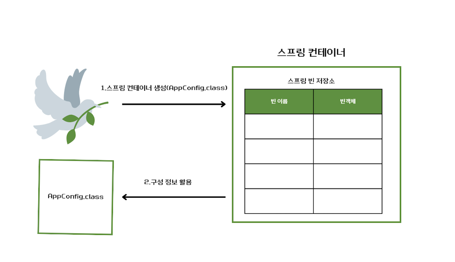 1)new AnnotationConfigApplicationContext(AppConfig.class); 2) 스프링 컨테이너 생성할 때는 구성 정보를 지정해주어야 한다. 3)여기서는 AppConfig.class를 구성 정보로 지정했다.