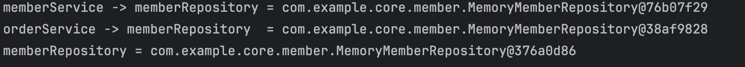 해당 출력결과를 통해 MemberRepository가 총 3번 출력된 것을 알 수 있다. 첫번째는 @Bean에 의해 스프링 컨테이너에 등록하기 위해서고 나머지 두번은 memberRepository()를 호출하면서 발생한 코드다.