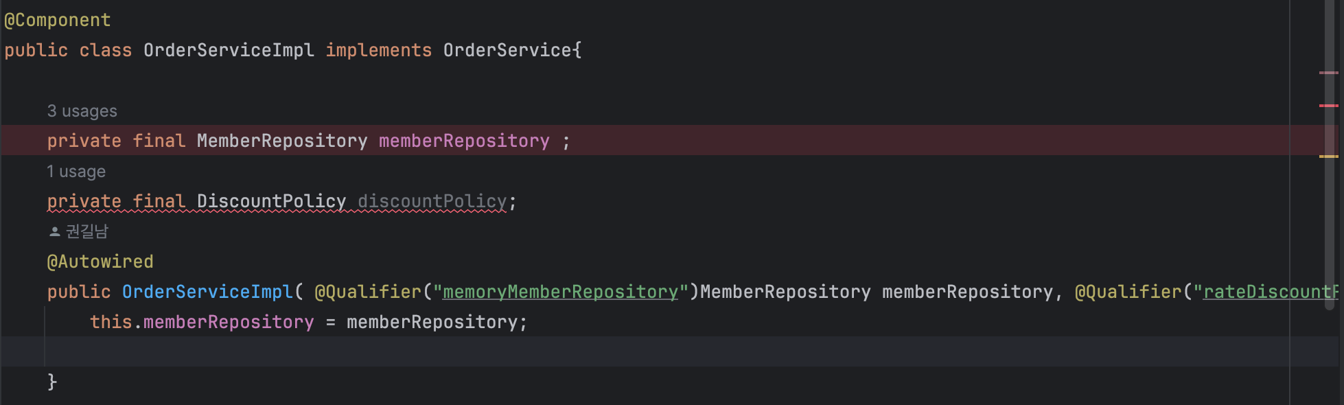 // public OrderServiceImpl( @Qualifier("memoryMemberRepository")MemberRepository memberRepository, @Qualifier("rateDiscountPolicy")DiscountPolicy discountPolicy) {