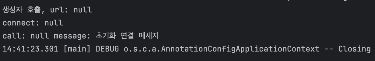 생성자 부분을 보면 url 정보 없이 connect가 호출되는 것을 확인할 수 있다. 객체를 생성하는 단계에는 url이 없고 , 객체를 생성한 다음에 외부에서 수정자 주입을 통해서 setUrl()이 호출되어야 url이 존재하게 된다.