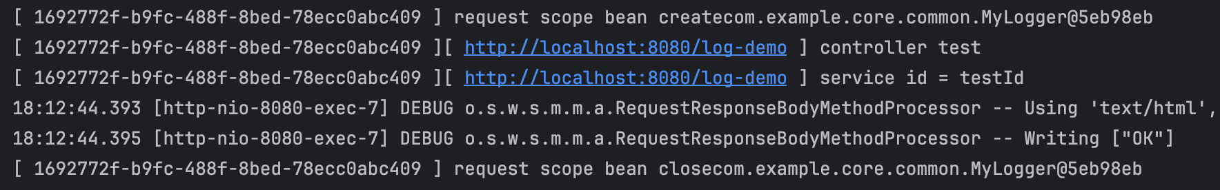 - 로그를 출력하기 위한 클래스 - @Scope(value = "request")를 사용하여 request 스코프 지정했다. 이 빈은 HTTP 요청 당 하나씩 생성되고, HTTP요청이 끝나면 소멸된다. - 이 빈이 생성되는 시점에 자동으로 @PostConstruct 초기화 메서드를 사용하여 uuid 를 생성하여 저장한다. - 이 빈은 요청 당 하나씩 생성되므로 , uuid를 저장해두면 다른 HTTP 요청과 구분할 수 있다. - 이 빈의 소멸 시점에서 @PreDestroy를 사용해서 종료 메세지를 남긴다. -'RequestURL'은 이 빈이 생성되는 시점을 알 수 없으므로 , 외부에서 setter로 입력 받는다. LogDemoController