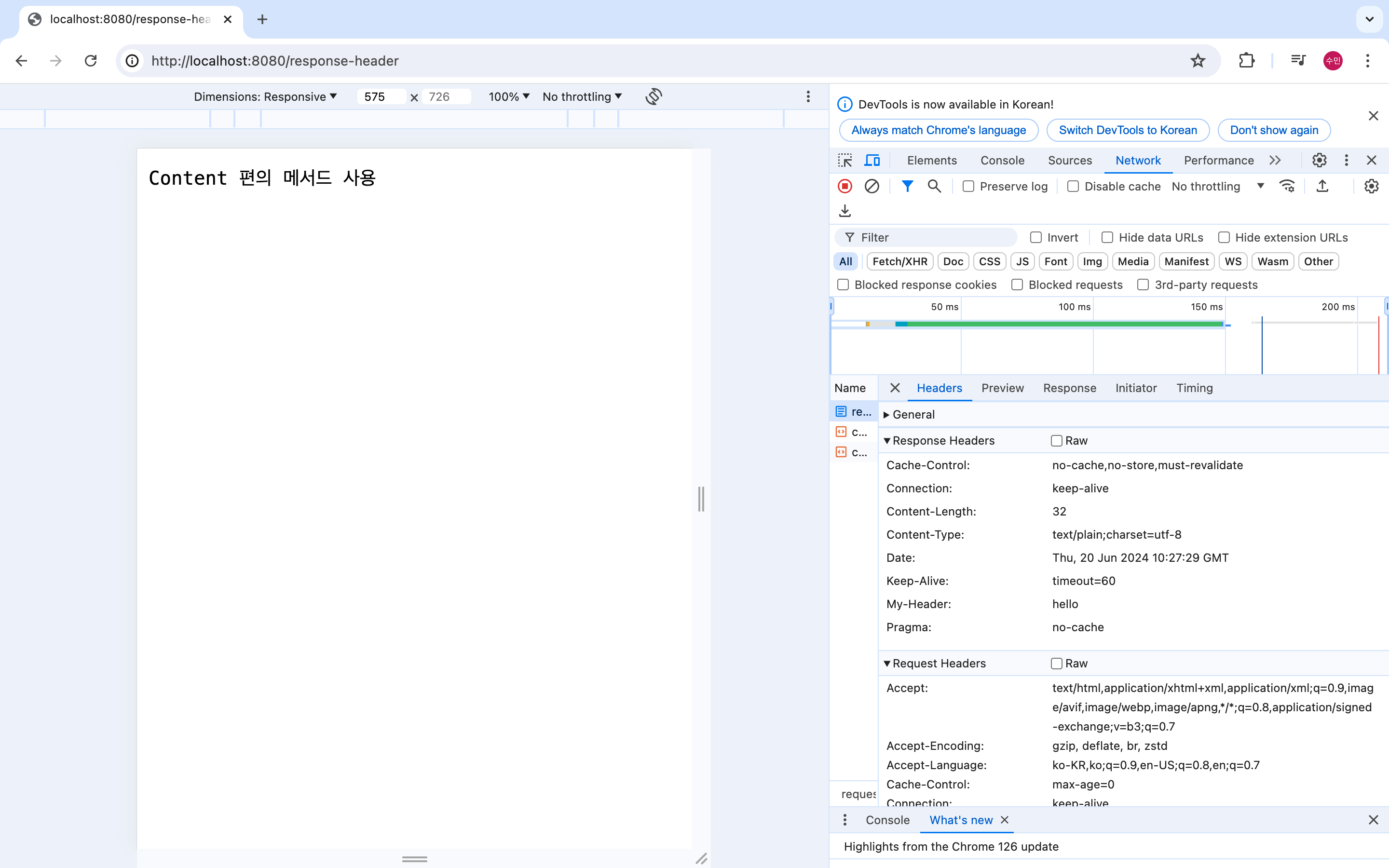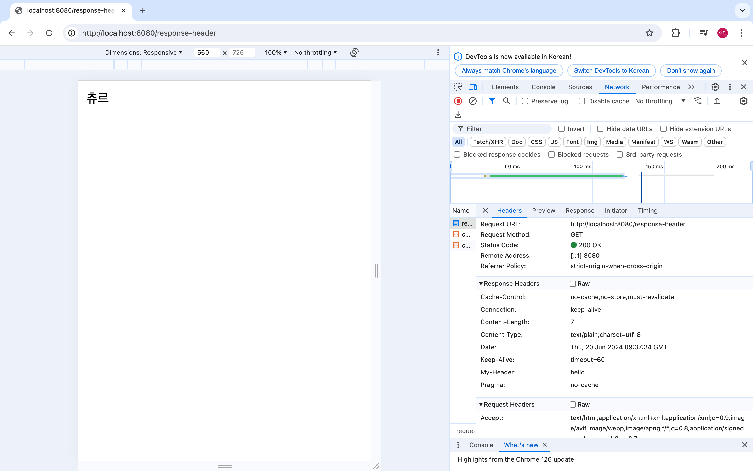 @WebServlet(name="responseHeaderServlet",urlPatterns = "/response-header") public class ResponseHeaderServlet extends HttpServlet { @Override protected void service(HttpServletRequest request, HttpServletResponse response) throws ServletException, IOException { //[status-line] response.setStatus(HttpServletResponse.SC_OK); // 상태코드: 커맨드 +B //[response-header] response.setHeader("Content-Type", "text/plain;charset=utf-8"); response.setHeader("Cache-Control", "no-cache,no-store,must-revalidate "); response.setHeader("Pragma", "no-cache");// 캐쉬 무효화 response.setHeader("my-header", "hello"); //[message body] PrintWriter writer = response.getWriter(); writer.println("츄르");