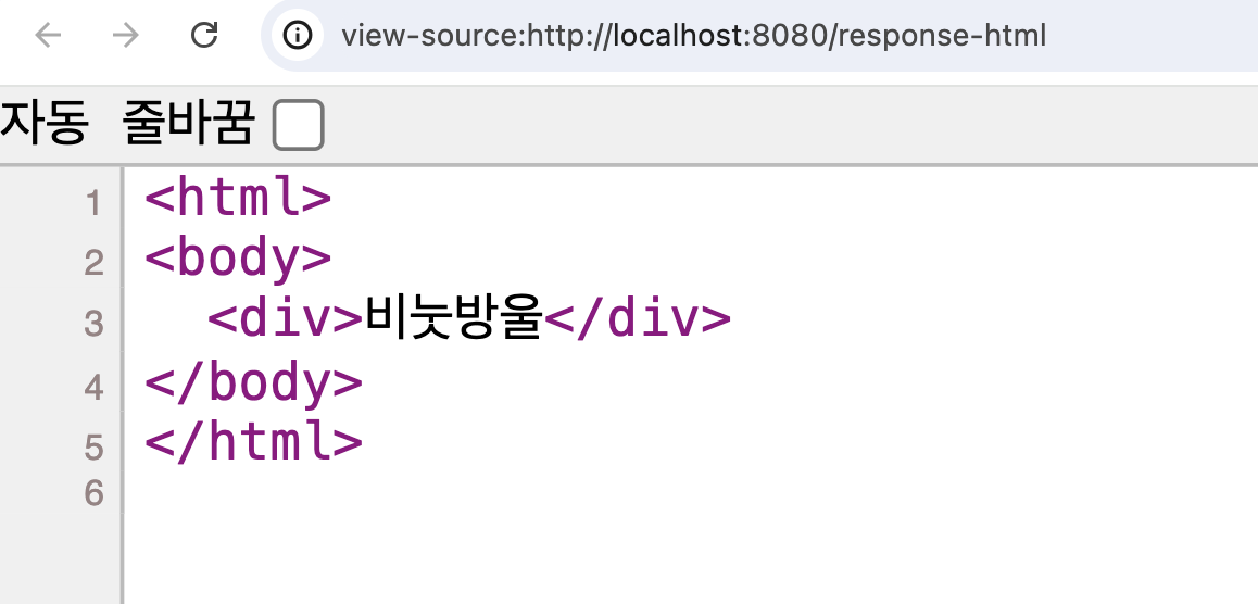 @WebServlet(name= "responseHtmlServlet",urlPatterns = "/response-html") public class ResponseHtmlServlet extends HttpServlet { @Override protected void service(HttpServletRequest request, HttpServletResponse response) throws ServletException, IOException { response.setContentType("text/html"); response.setCharacterEncoding("utf-8"); PrintWriter writer = response.getWriter(); writer.println("<html>"); writer.println("<body>"); writer.println(" <div>비눗방울</div>"); writer.println("</body>"); writer.println("</html>"); } }우클릭 -> 페이지 소스 보기