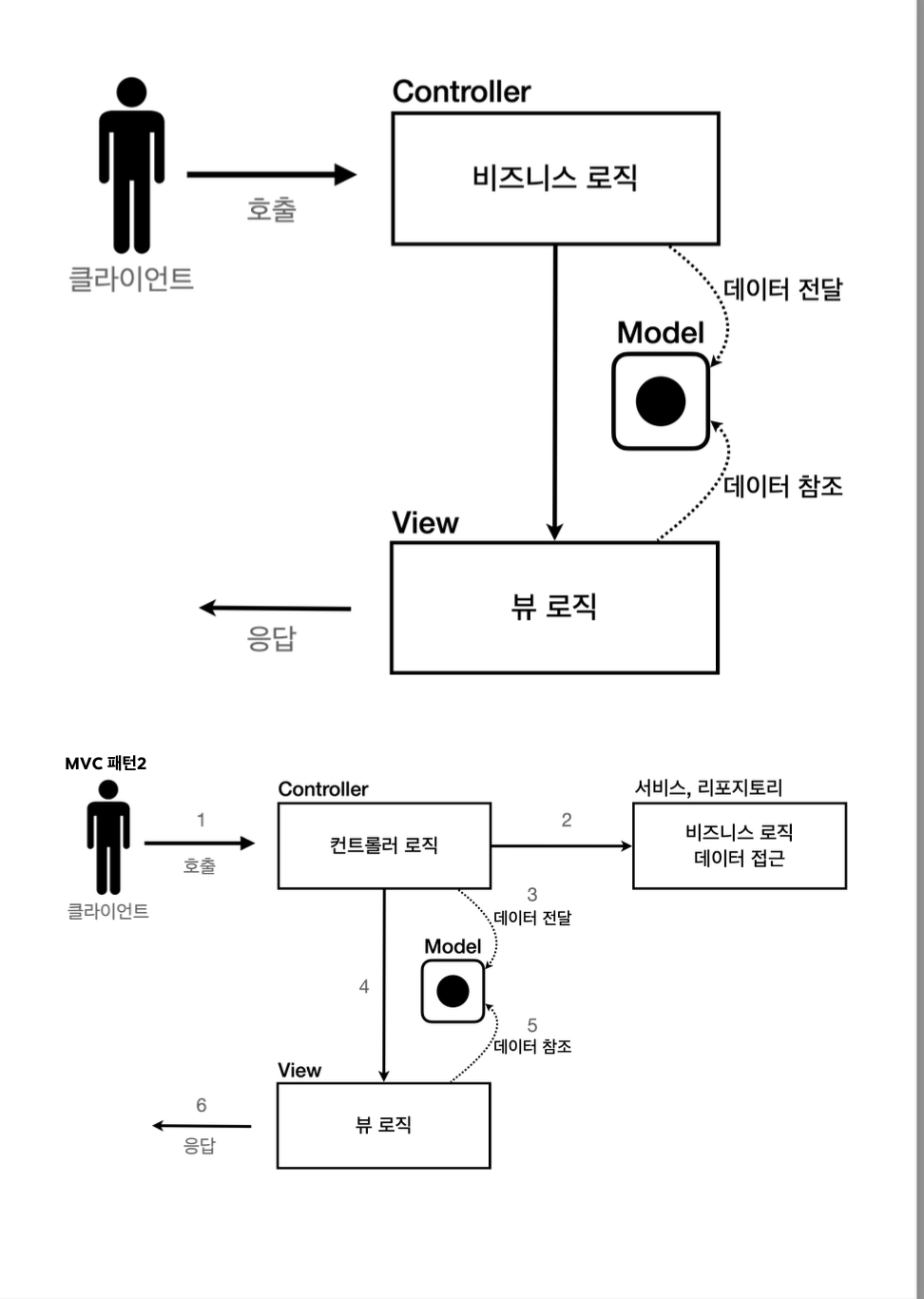 - 컨트롤러: HTTP 요청을 받아서 파라미터를 검증하고, 비즈니스 로직을 실행한다. 그리고 뷰에 전달할 결과 데이터를 조회해서 모델에 담는다. - 모델: 뷰에 출력할 데이터를 담아둔다. 뷰가 필요한 데이터를 모두 모델에 담아서 전달해주는 덕분에 뷰는 비즈니스 로직이나 데이터 접근을 몰라도 되고, 화면을 렌더링 하는 일에 집중할 수 있다.