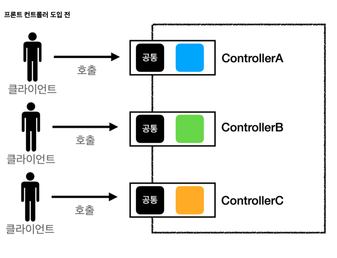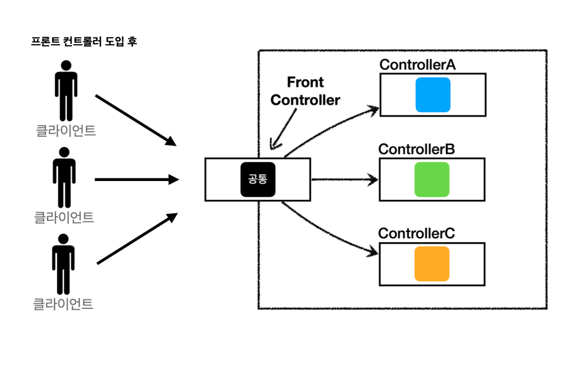 프론트 컨트롤러에 각 컨트롤러에 공통된 부분을 뺀다. (아래 그림 처럼)프론트 컨트롤러의 특징 !