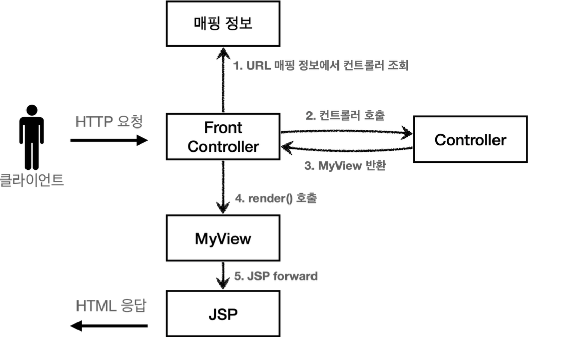 controller.process(request, response);controller.process(request, response);는 MyView 객체를 반환하고, 이후 myView.render(request, response);에서 해당 MyView 객체의 render 메서드를 호출하여 뷰를 렌더링합니다.