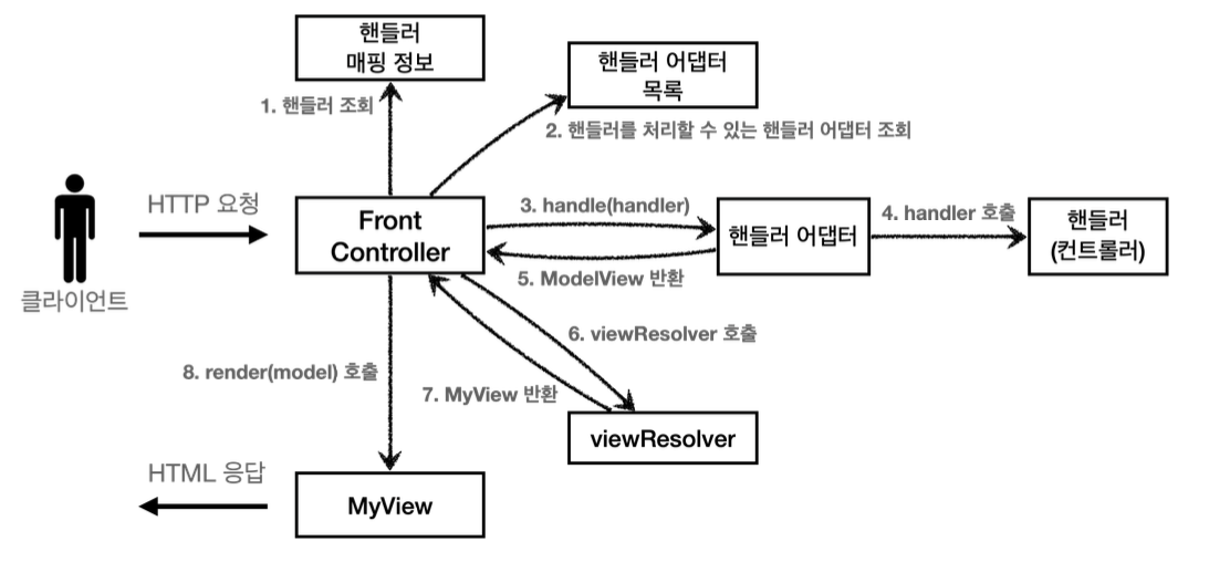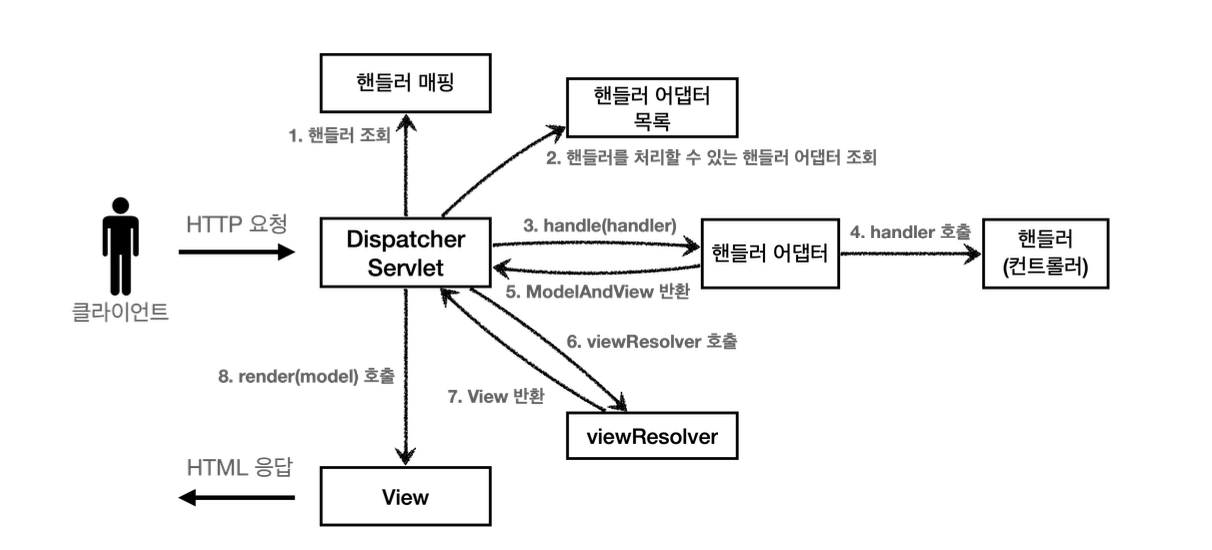 동작 순서 (코드랑 같이 보기) 1 . 핸들러 조회: 핸들러 매핑을 통해 요청 URL에 매핑된 핸들러(컨트롤러)를 조회한다. 2 . 핸들러 어댑터 조회: 핸들러를 실행할 수 있는 핸들러 어댑터를 조회한다. 3 . 핸들러 어댑터 실행: 핸들러 어댑터를 실행한다. 4 . 핸들러 실행: 핸들러 어댑터가 실제 핸들러를 실행한다. 5 . ModelAndView 반환: 핸들러 어댑터는 핸들러가 반환하는 정보를 ModelAndView로 변환해서 반환한다. 6 . viewResolver 호출: 뷰 리졸버를 찾고 실행한다 7 . View 반환: 뷰 리졸버는 뷰의 논리 이름을 물리 이름으로 바꾸고, 렌더링 역할을 담당하는 뷰 객체를 반환한다 8 . 뷰 렌더링: 뷰를 통해서 뷰를 렌더링 한다.