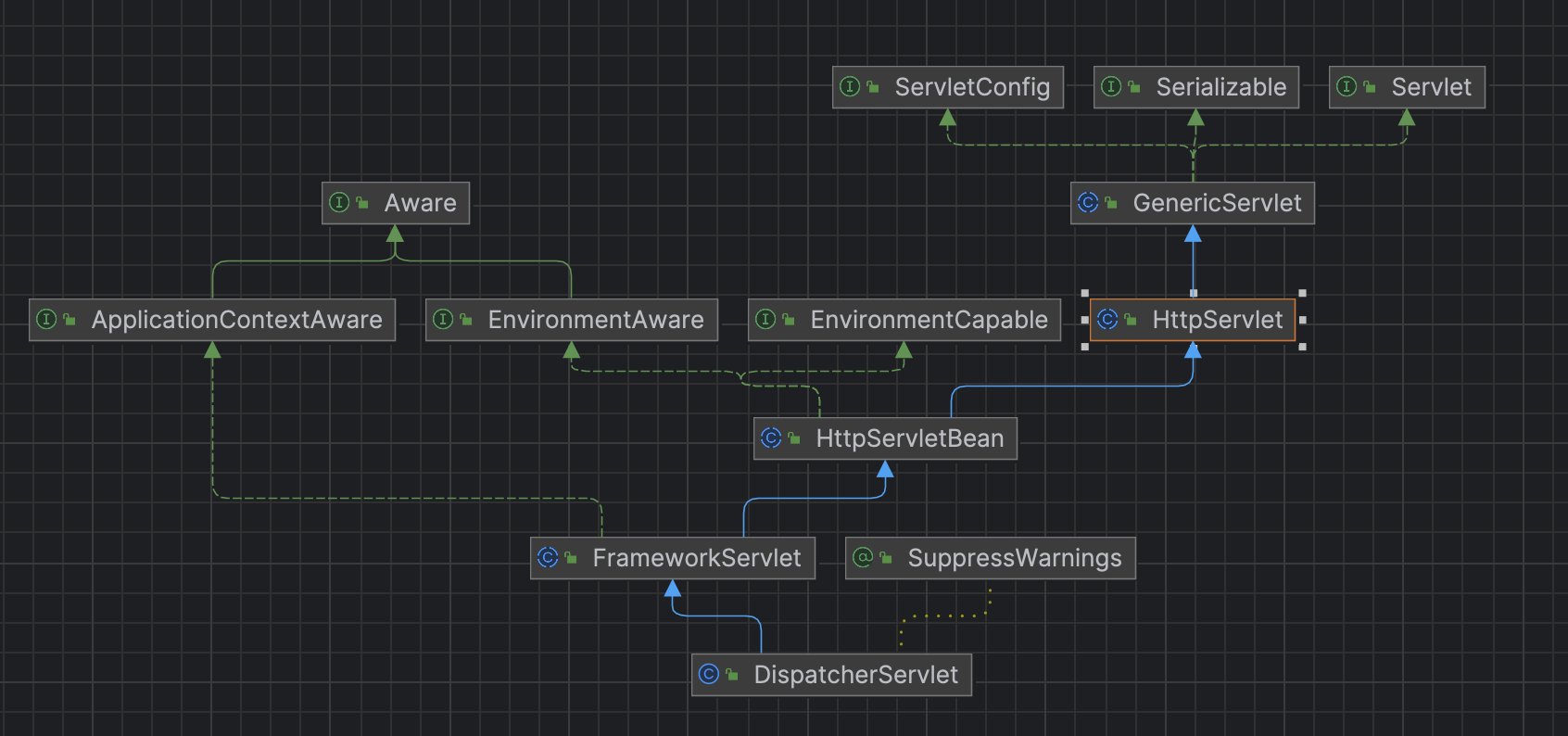 - FrameworkServlet.service()` 를 시작으로 여러 메서드가 호출되면서 최종적으로 DispatcherServlet.doDispatch()가 호출된다.