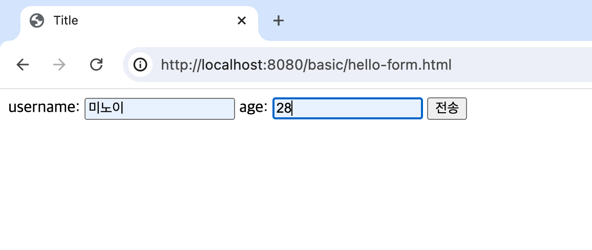 <!DOCTYPE html> <html> <head> <meta charset="UTF-8"> <title>Title</title> </head> <body> <form action="/request-param-v1" method="post"> username: <input type="text" name="username" /> age: <input type="text" name="age" /> <button type="submit">전송</button> </form> </body> </html>