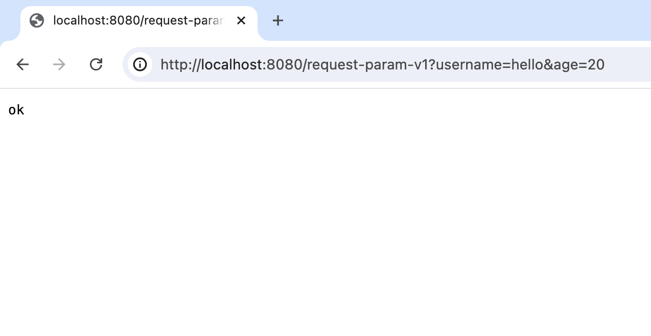 위 코드를 통해 username 변수에는 hello가, age 변수에는 20이 저장된다.String username = request.getParameter("username"); String age = request.getParameter("age");