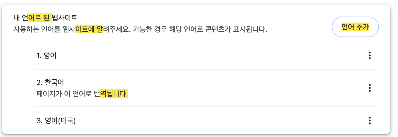 웹으로 확인하기 웹 브라우저의 언어 설정 값을 변경하면서 국제화 적용을 확인해보자. 크롬 브라우저 설정 언어를 검색하고, 우선 순위를 변경하면 된다. 우선순위를 영어로 변경하고 테스트해보자. 웹 브라우저의 언어 설정 값을 변경하면 요청시 `Accept-Language` 의 값이 변경된다. `Accept-Language` 는 클라이언트가 서버에 기대하는 언어 정보를 담아서 요청하는 HTTP 요청 헤더이다. (더 자세한 내용은 모든 개발자를 위한 HTTP 웹 기본지식 강의를 참고하자.) 짜잔