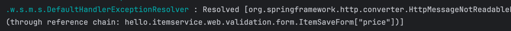`HttpMessageConverter` 에서 요청 JSON을 `ItemSaveForm` 객체로 생성하는데 실패한다. 이 경우는 `ItemSaveForm` 객체를 만들지 못하기 때문에 컨트롤러 자체가 호출되지 않고 그 전에 예외가 발생한다. 물론 Validator도 실행되지 않는다.