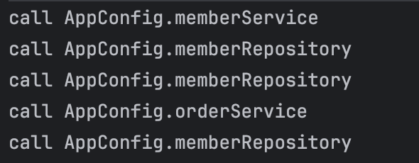 해당 출력결과를 통해 MemberRepository가 총 3번 출력된 것을 알 수 있다. 첫번째는 @Bean에 의해 스프링 컨테이너에 등록하기 위해서고 나머지 두번은 memberRepository()를 호출하면서 발생한 코드다.