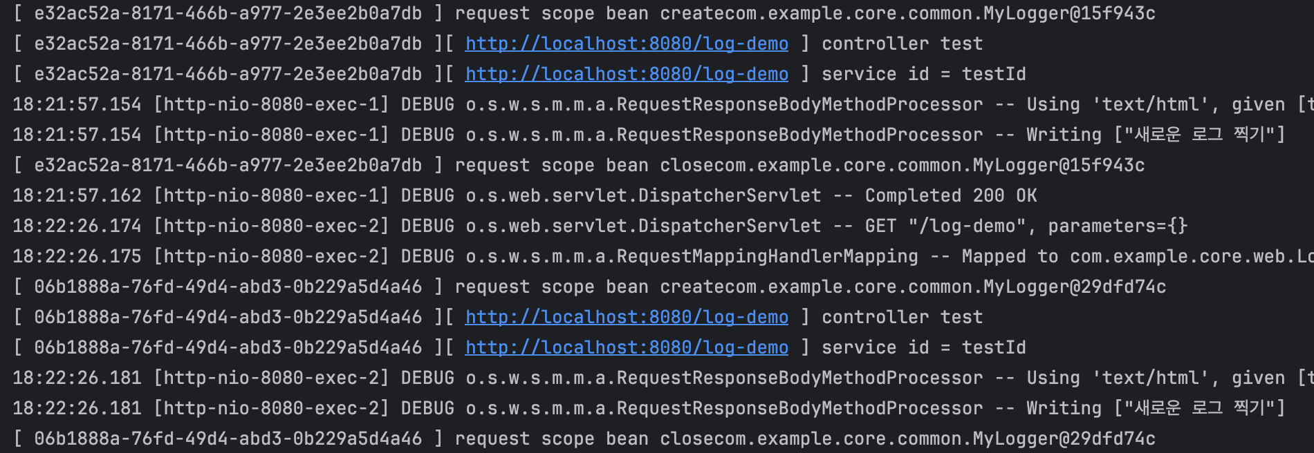 동시에 여러 HTTP 요청이 오면 정확히 어떤 요청이 남긴 로그인지 구분하기 어렵다. 이럴때 사용하기 좋은 것이 request스코프이다.