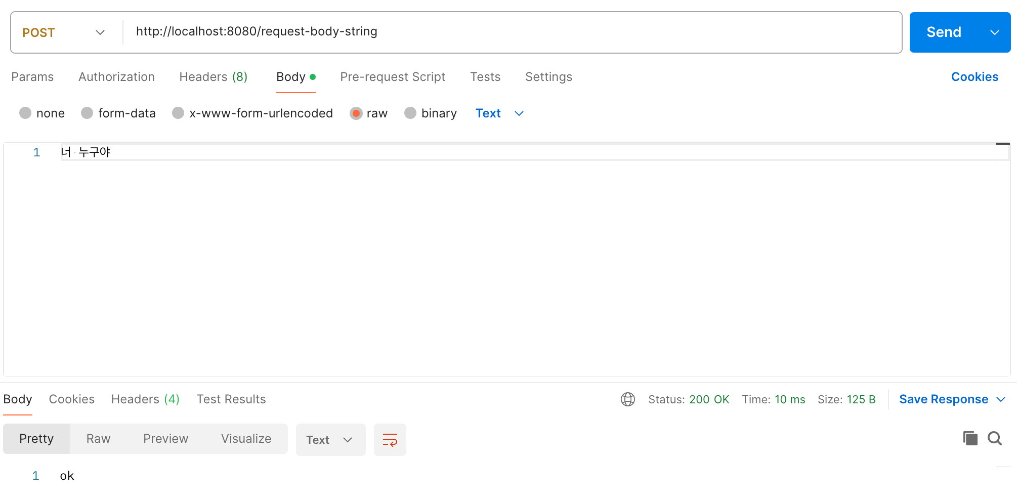 @WebServlet(name = "requestBodyStringServlet", urlPatterns = "/request-body-string") public class RequestBodyStringServlet extends HttpServlet { @Override protected void service(HttpServletRequest request, HttpServletResponse response) throws ServletException, IOException { ServletInputStream inputStream = request.getInputStream(); //바이트 코드 String messageBody = StreamUtils.copyToString(inputStream,StandardCharsets.UTF_8); // 바이트 코드 -> String System.out.println("messageBody = " + messageBody); response.getWriter().write("ok"); } }