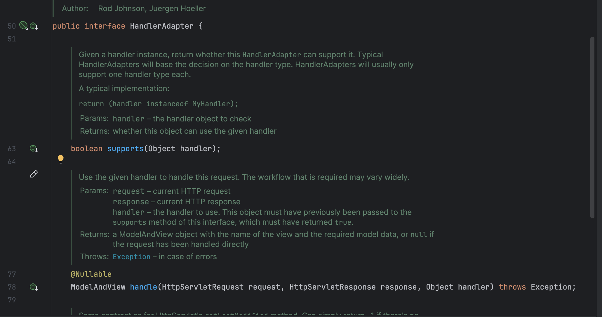 핸들러 어댑터 (Handler Adapter) - 인터페이스: `org.springframework.web.servlet.HandlerAdapter` - 역할: 핸들러 매핑이 결정한 핸들러를 실제로 실행합니다. - 주요 구현체: - `RequestMappingHandlerAdapter`: 애노테이션 기반 컨트롤러 처리 - `SimpleControllerHandlerAdapter`: `Controller` 인터페이스를 구현한 전통적인 스프링 컨트롤러 처리